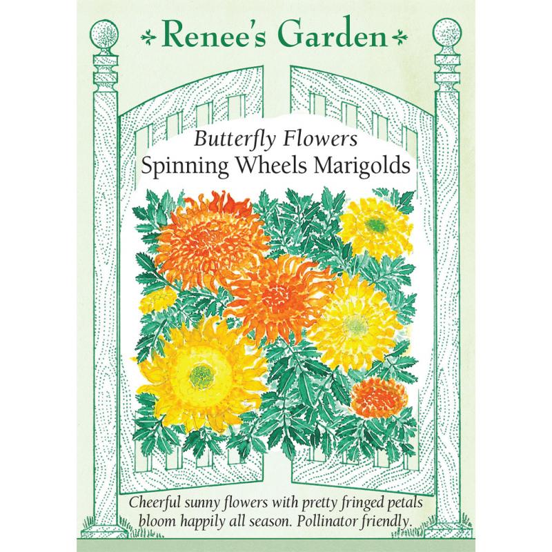 | (Tagetes erecta) These long blooming heirloom marigolds have dense, short-petaled centers with a pretty fringe of curved petals around the blossom edges. We’ve made a colorful mix of lemon yellow, soft gold and rich orange for bright bouquets. These branching plants with their attractive crisp, blue-green foliage bloom all summer with big, 2 1/2 inch flowers that literally cover the plants, attracting myriads of butterflies, honeybees and many other pollinators. |