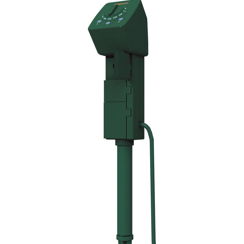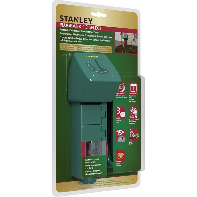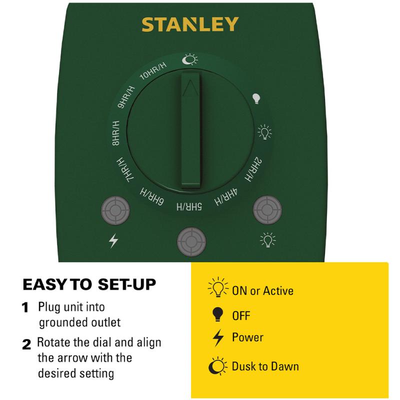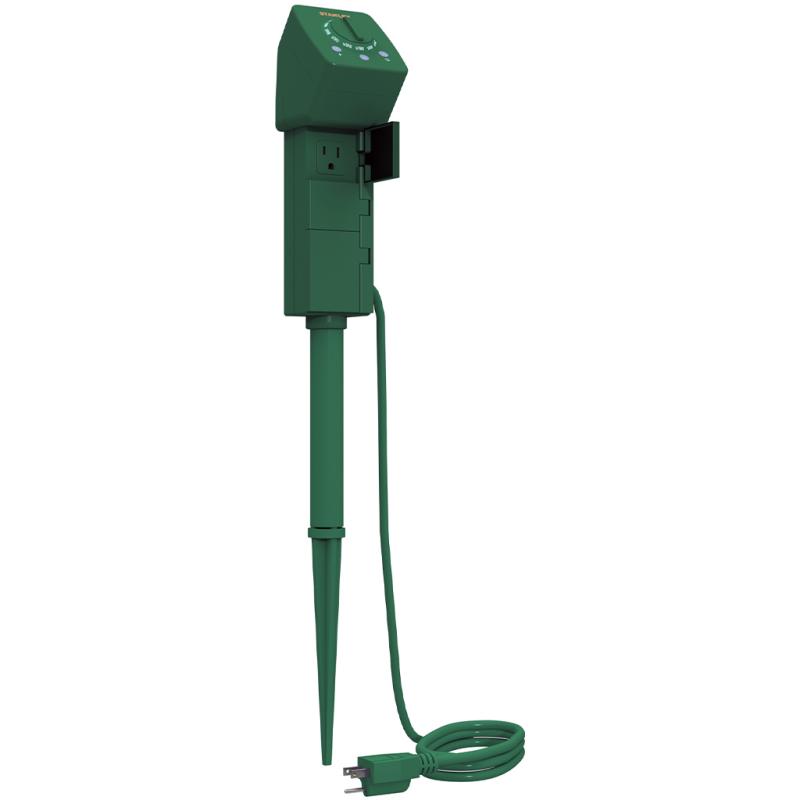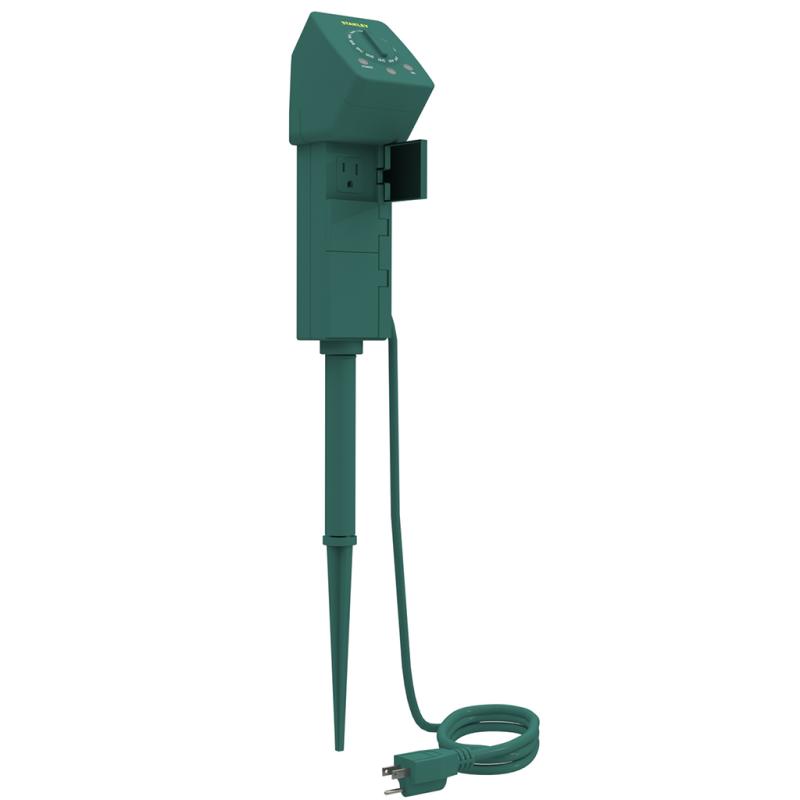 Description: This Stanley darkness-sensing 3-outlet green ground Stake has three grounded outlets, hinged outlet covers, a wall mountable, and a 12" rotating ground stake. It has overload protection with the built-in reset button. The program repeats daily with a constant ON/OFF option. It can be set from dusk for 2 to 10 hours. The overall height is 12 inches.