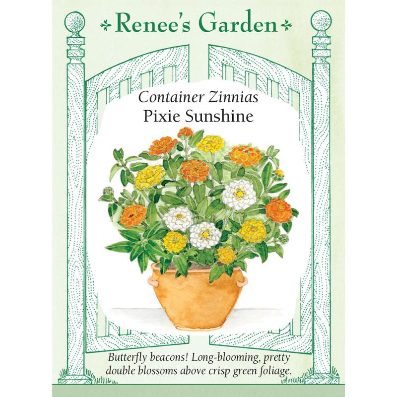 | (Zinnia elegans) Our exclusive color combo of these easy care, 8 to 12 inch zinnias offers a sparkling trio in perfectly matched shades of rich buttery yellow, citrus orange and white. Pots of Pixie’s rounded, fully double 2 to 3 inch blossoms shine above crisp green foliage to brighten bare corners or add cheerful color to a front porch or walk or backyard patio garden. Summer butterflies will delight in petite Pixie Sunshine's nectar and long bloom. |