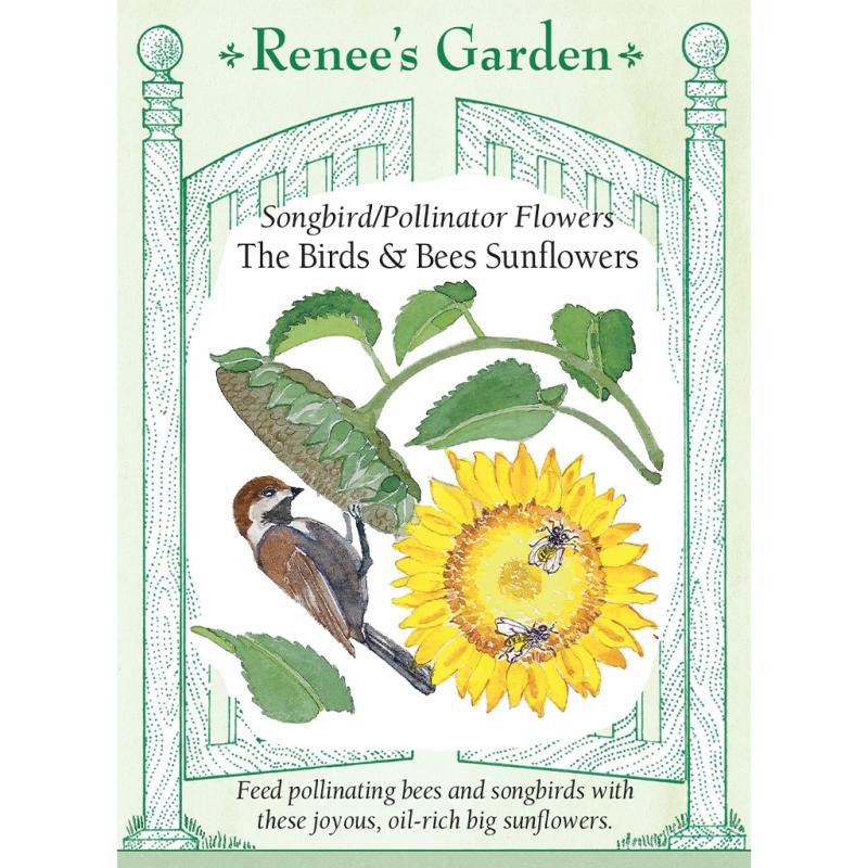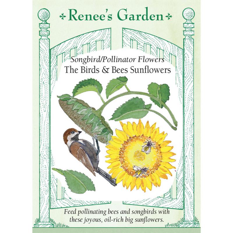| (Helianthus annuus) Enhance your garden’s eco-system with these sturdy, 6 to 8 foot tall sunflowers whose golden-yellow petals and chocolate discs seem to literally follow the sun. During blooming season they offer a rich pollen and nectar source for foraging honey bees, native bees and any other garden pollinators. At maturity, these black seeded sunflowers provide particularly oil-rich kernels with somewhat softer shells than others, yielding an abundance of nutritious feasts for birds. |