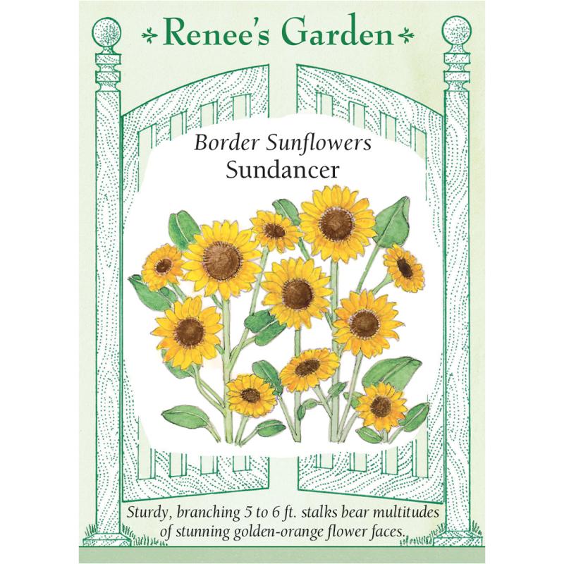 | This outstanding sunflower grows quickly and blooms early. The vigorous, multi-branched plants are quickly covered with masses of cheerful flower faces whose perfectly formed, deep golden-orange petals are evenly arranged around richly colored center discs. Sundancer flowers so heavily that you can grow the 4 to 6-foot plants as a stunning blooming border or hedge and also enjoy armfuls as lovely cut flowers for bouquets and arrangements. |