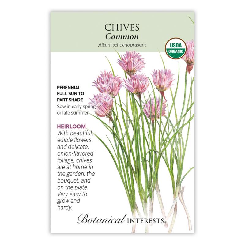 | Chives are super easy to grow, require little maintenance, tolerate drought, and come back year after year. Edible flowers are loved by bees, make a tasty chive vinegar, look and taste great in salads, and dry well for arrangements; foliage and/or flowers add a subtle onion flavor to many dishes. Great for containers; grow indoors for year-round harvest. |