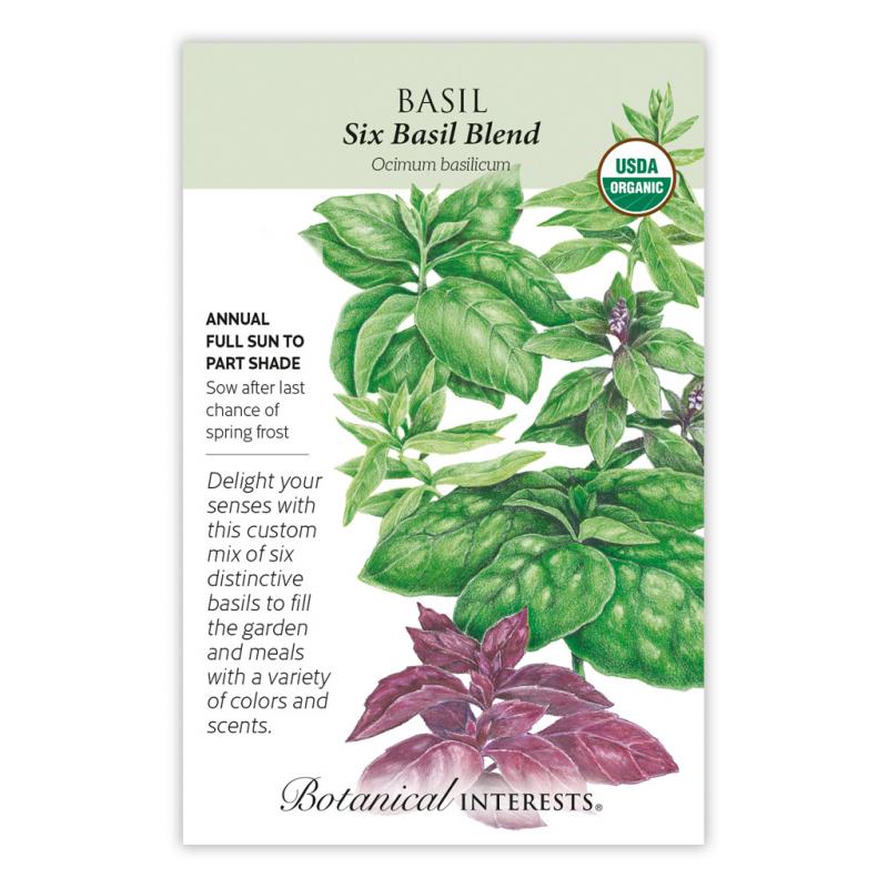 | Imagine the many ways you can use the wonderful textures, scents, and flavors in this unique blend of basils! Blend includes Genovese and large leaf basil for pesto and pasta; 'Dark Opal' for colorful vinegars; lime for flavored oils, sauces, and sorbet; lemon for chicken, fish, and pasta dishes; and cinnamon to add an extra flavor kick to fruit salads. There are dozens of ways to enjoy this bountiful blend of basils! Be sure to freeze extra basil in cubes of olive oil to make pesto throughout the year and save some stalks for your floral arrangement. |