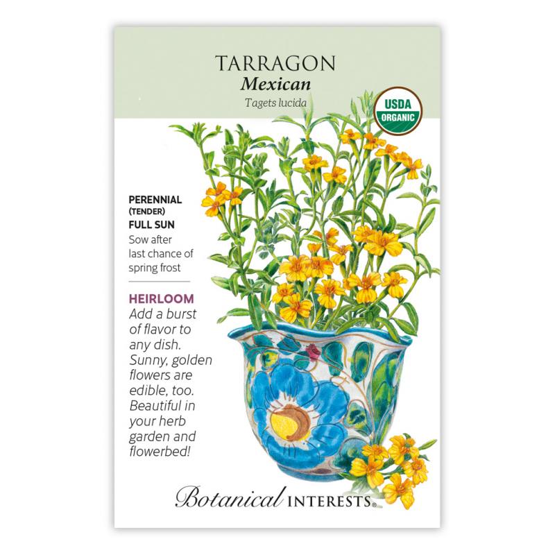 | Mexican tarragon is a type of marigold that produces delicious leaves with notes of anise. It can be used as a substitute for French tarragon, and it is easier to grow in heat and humidity, while being fairly drought tolerant. The leaves have a stronger flavor so less is needed to flavor a dish. Excellent container herb that can be grown indoors during the winter. Also called Mexican Mint and Spanish, Texas, or Winter tarragon. |