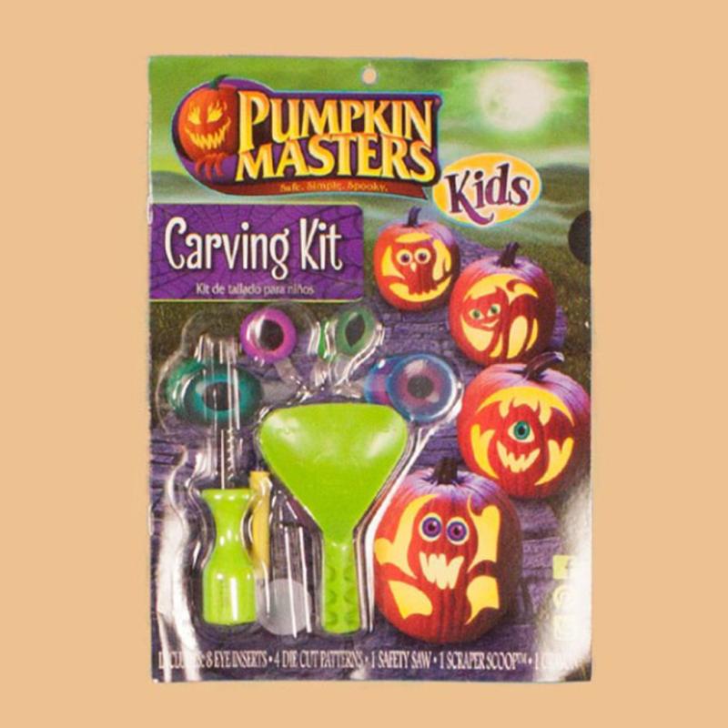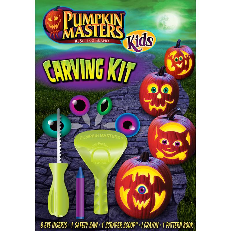| Pumpkin Masters #1 kid's carving kit with specially designed tools. It includes the kid-friendly DuraSaw, Scraper Scoop, quick pattern stencils, 4 pairs of eyes, and crayon. Great for ages 6+. |