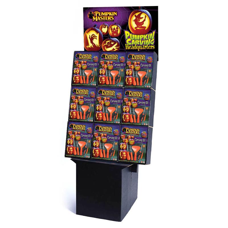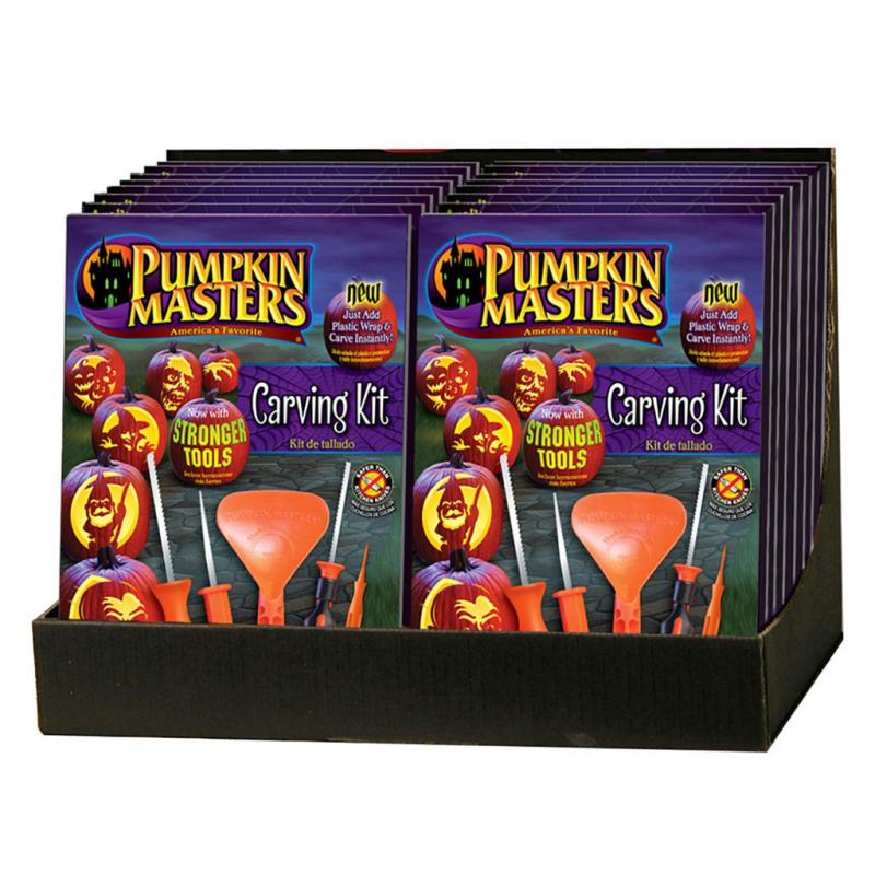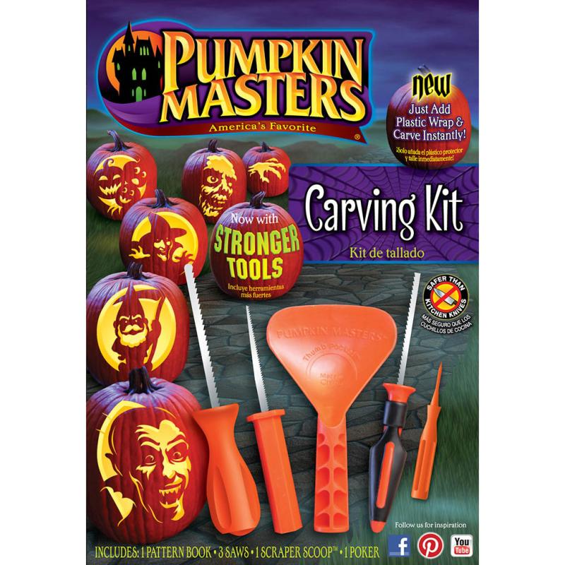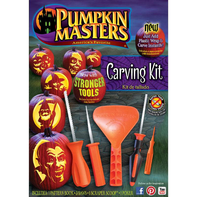 Pumpkin Masters #1 kid's carving kit with specially designed tools. It includes the kid-friendly DuraSaw, Scraper Scoop, quick pattern stencils, 4 pairs of eyes, and crayon. Great for ages 6+.