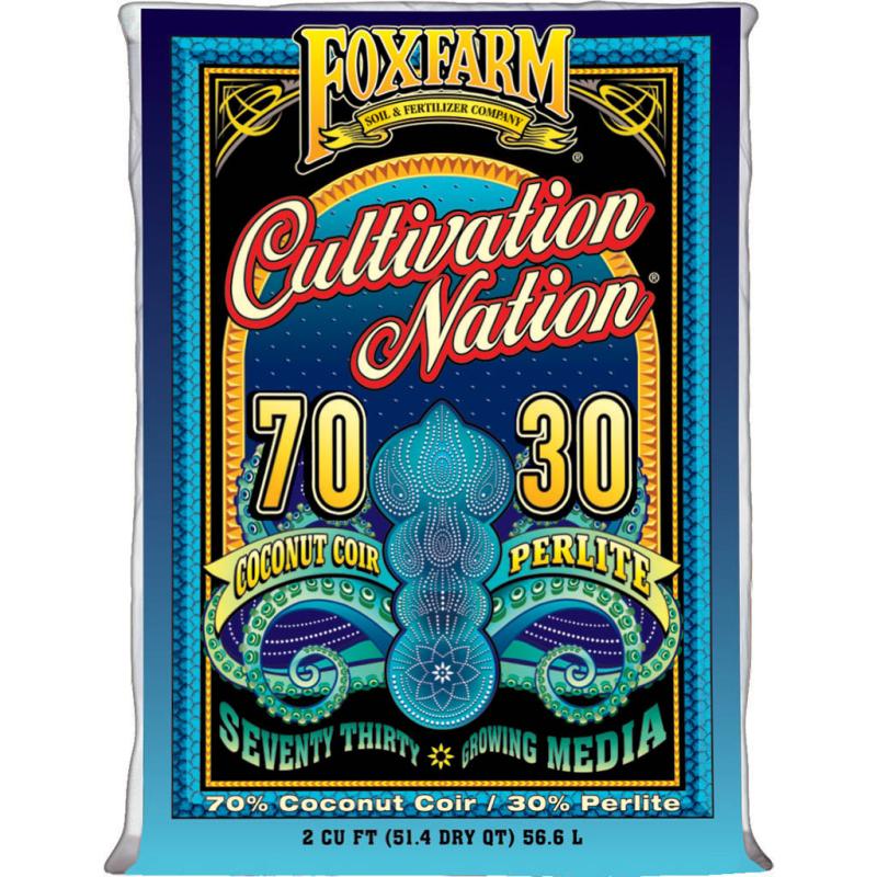 Description: 70% Coconut Coir / 30% Perlite. Cultivation Nation Seventy Thirty Growing Media is a mixture of buffered coconut coir and perlite, blended in the classic ratio of 70:30. Coconut coir is known for its water holding capabilities, and perlite is included to provide air spaces in the media, facilitating aeration and drainage. For best results, use in conjunction with FoxFarm Cultivation Nation fertilizers and pH adjusters. Cultivation Nation Seventy Thirty Growing Media is designed for use in containers in outdoor or indoor growing environments. Plant directly into this blend. When watering, add enough to fully saturate the media, allowing excess water to drain from the bottom of the container.