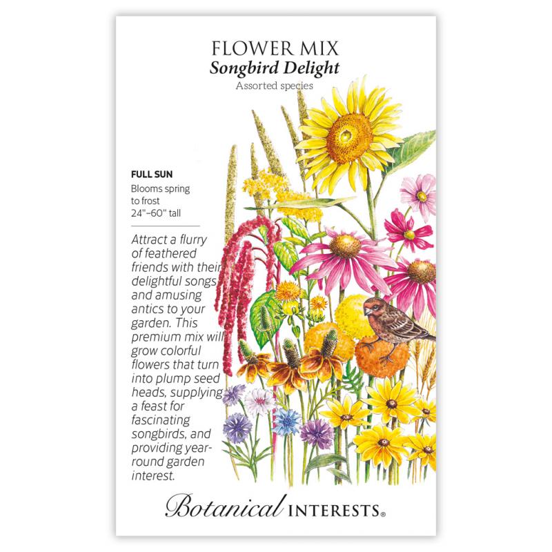 | Lure colorful finches, cardinals, blue jays and nuthatches to your garden to dine on the variety of tasty seeds from the flowers that grow from this mix. A collection of annual and perennial blooming plants fill the summer garden with blue, pink, purple, white, red, orange and yellow flowers in an assortment of shapes and sizes, followed by seed heads for hungry birds. Mix includes (see diagram): Polka Dot Mix Bachelor Button Black-Eyed Susan Purple Coneflower Cosmos Rigid Goldenrod Love-Lies-Bleeding African Marigold Mexican Hat Hybrid Pearl Millet Safflower Black Oil Sunflower Hard Red Spring Wheat |