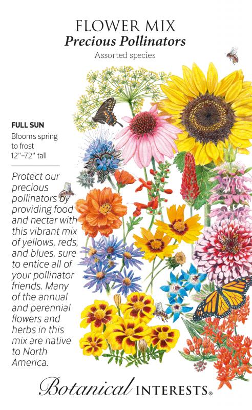 | Did you know pollinators help us by pollinating a third or more of the food we eat? Precious Pollinators mix provides food and nectar to a wide range of pollinators, including insects, butterflies, and moths. Colorful mix with varying heights and bloom times of annual and perennial flowers and herbs, many of which are native to North America. Mix includes (see diagram): Smooth Aster Borage Cosmos Dill Lance-leaved Coreopsis Lemon Bee Balm Naughty Marietta Marigold Milkweed Phacelia Purple Coneflower Red Clover Scarlet Sage Sunflower, Queen mix California Giant Zinnia |