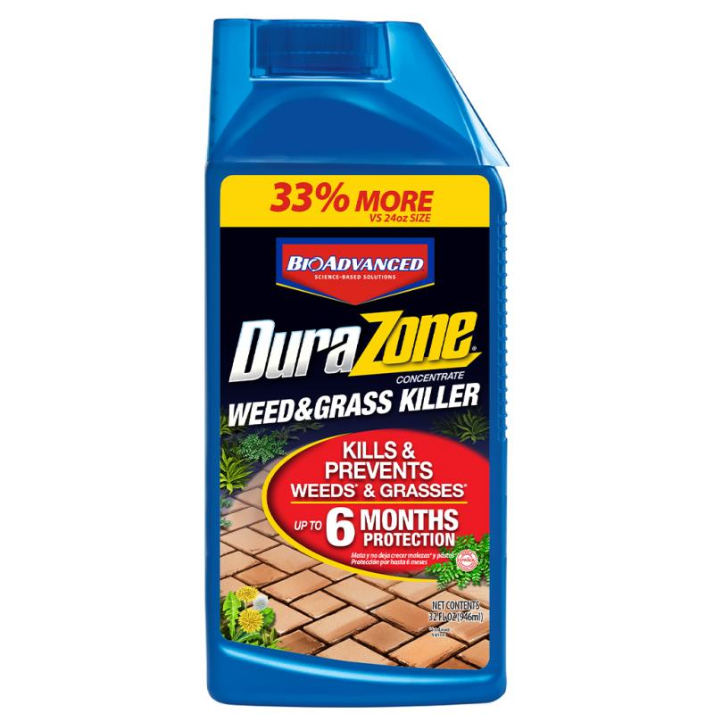 Description: DuraZone Weed & Grass Killer kills all types of existing weeds and grasses. One treatment creates a continuous-action weed and grass barrier for up to 6 months. For use on driveways, sidewalks, patios, along fences and foundations, and around walkways and mulched areas. Concentrate can be used to refill DuraZone. Active ingredients: 0.089% indaziflam; 0.89% diquat dibromide; 20.46% glyphosate isopropylamine salt.