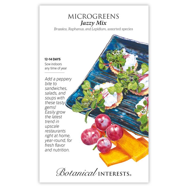 | The varieties in this custom mix will all be the perfect 1"–2" size at the same time, with an appealing flavor and texture combination as well as a beautiful color presentation. Nutritious microgreens can be grown at any time of the year, and are a nutrient-packed way to get your "green fix" in the dead of winter. Move containers as needed for best light exposure and temperature (65°–75°F). Jazzy Mix microgreens are ready to harvest in about 12 to 14 days after sowing, when they have cotyledons (first leaves), or when the first true leaves (second set of leaves) have begun to form, depending on preference. Mix includes: 30% Sawtooth mustard, 30% Peppergrass cress, 15% Red Acre cabbage, 15% Red Giant mustard, and 10% China Rose radish |