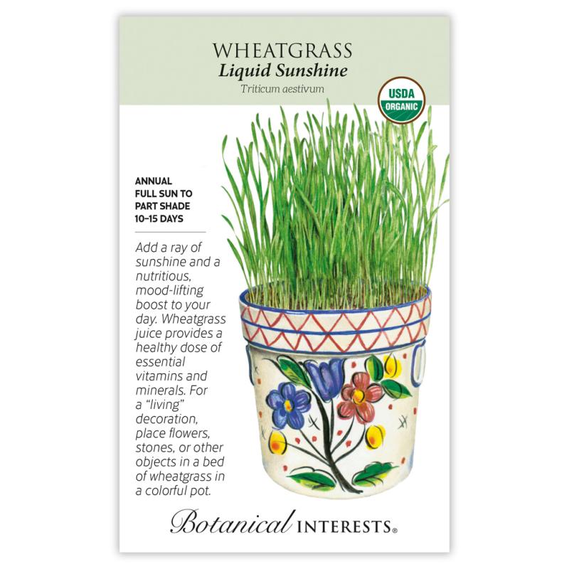| Wheatgrass juice contains an abundance of nutrients. The seeds, also known as hard red winter wheat, germinate rapidly into beautiful greens that can be juiced; the juice is packed with vitamins, minerals, and chlorophyll. Be sure to save some seeds to sow for beautiful greenery in indoor containers for table centerpieces (especially to nestle eggs in at Easter!). |