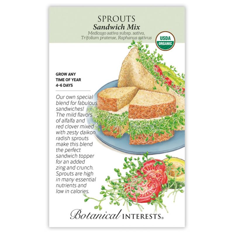 | We put together this special mix of mild alfalfa and red clover, with just enough spicy radish to add lively flavor and texture to your sandwiches. But don't stop there! Try these sprouts in scrambled eggs, omelets, salads, and stir-fried with other vegetables—the culinary possibilities are limited only by your imagination! |