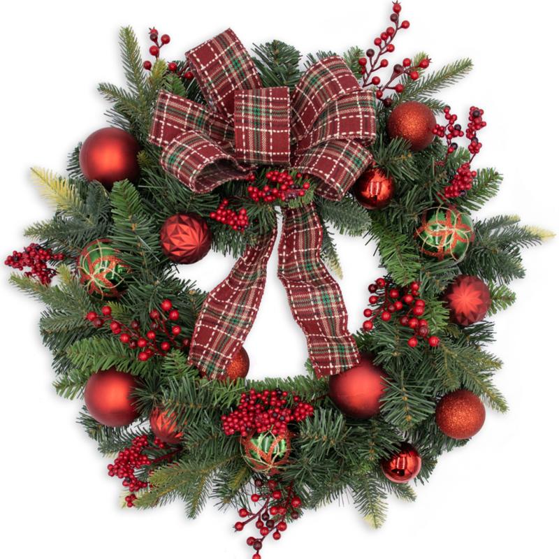 Ormans Mixed Pine Wreath with Plaid Bow Berries and Balls