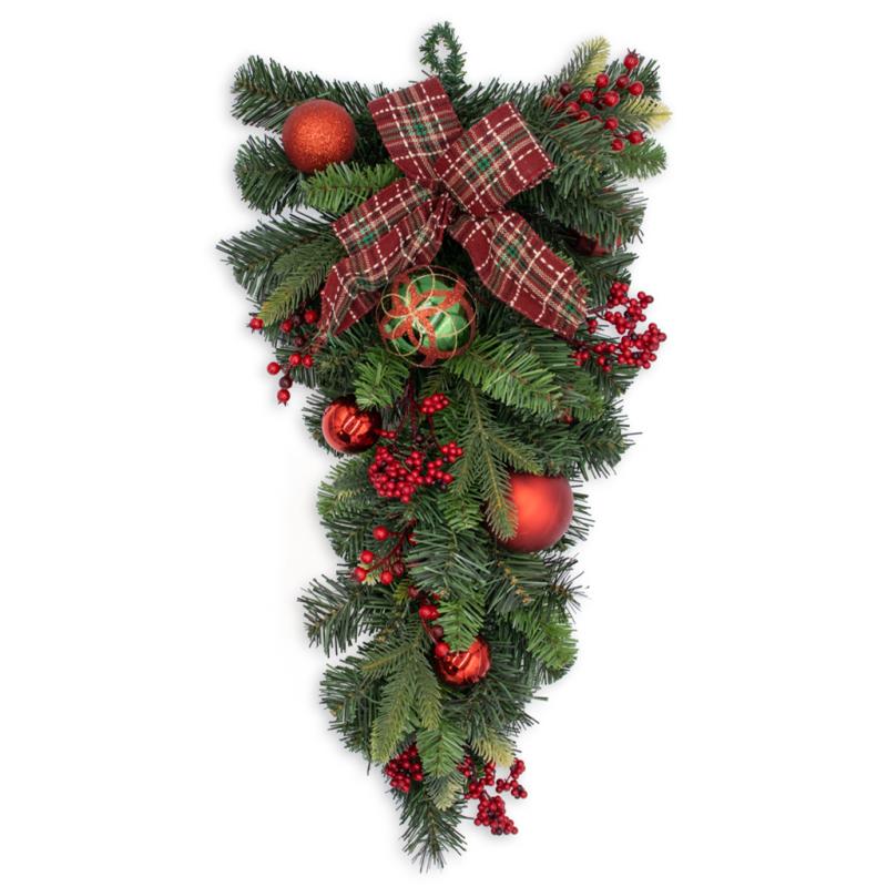 Teardrop 24" Mixed Pine Teardrop w/Red/Green Balls and Plaid Bow