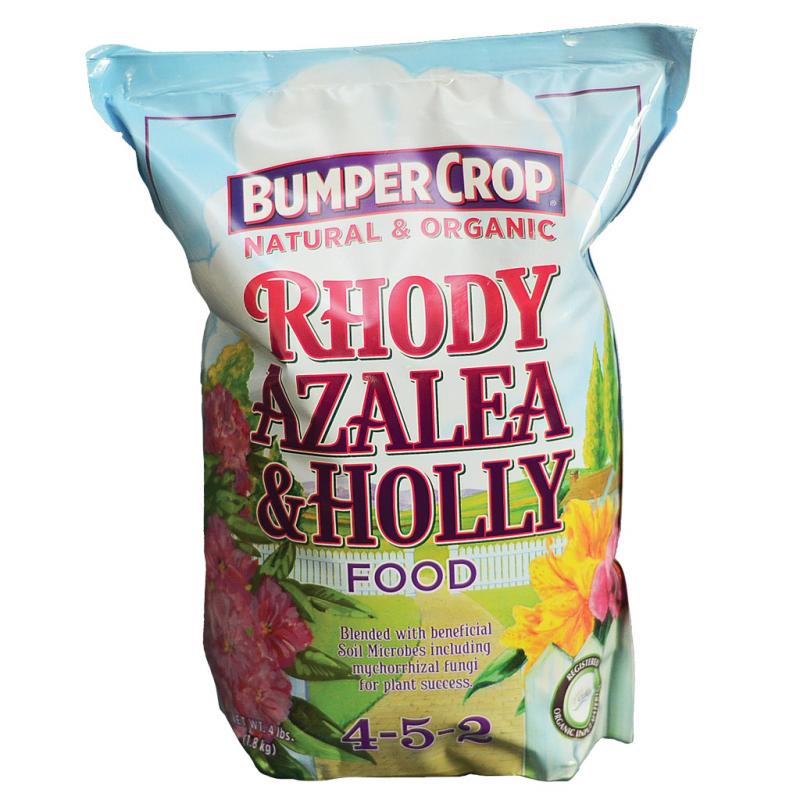 | Master Nursery® Bumper Crop® Natural & Organic Rhododendron, Azalea & Holly Food is a blend of natural ingredients, formulated specifically for the needs of acid-loving plants. It is acceptable for use in organic production. It will encourage growth, green foliage, and beautiful flowers. It is also suited for use on other acid-loving plants, including fuchsia and evergreen conifers. |
