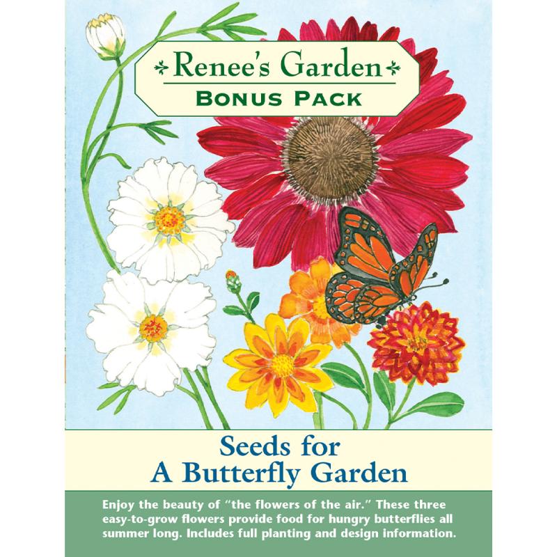 | Attract and enjoy enchanting garden butterflies, "the flowers of the air." Our large Bonus Pack contains three inner packets of easy-to-grow butterfly flowers, whose ample nectar will bring butterflies to the garden all summer long. Includes carefully written, complete planting and growing instructions and butterfly garden design suggestions. This pack includes Zinnia 'Persian Carpet;' Cosmos 'Purity;' Sunflower 'Chocolate Cherry' | |
