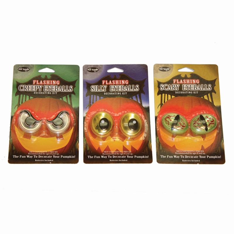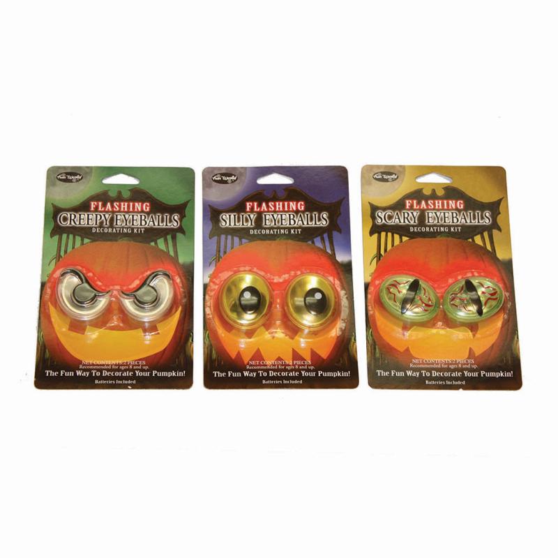 | An easy way to decorate your pumpkin without the mess of carving. Just paint a face on your pumpkin and add a set of pumpkin eyeballs. Choose from creepy with flashing eyes, silly with flashing eyes, and surprised with color changing eyes. Batteries are included. |