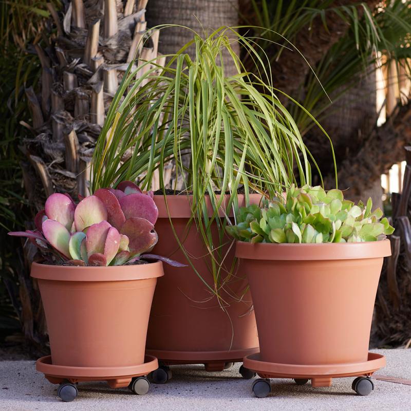 Heavy-duty rolling plant caddy with wheels. Provides mobility to heavy planters and allows you to move potted plants with ease. Terra cotta.