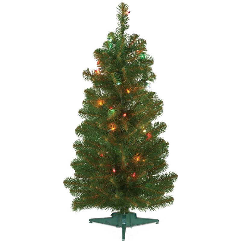 | A pre-lit, green PVC tabletop tree with rounded tips comes with incandescent lights and a green plastic base. Size/Base: 3' H x 19" Dia. Tips: 145 Lights: 50 Multi |