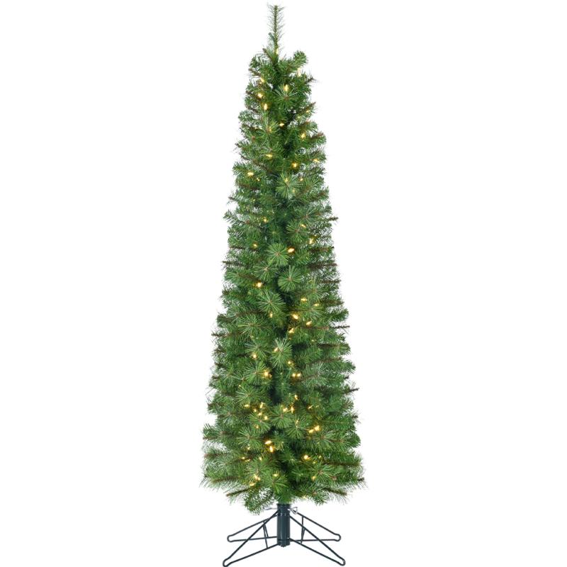 Description: The Royal Cashmere slim tree features a 3-piece hinged construction with PVC, medium green mixed tips on both cashmere and stiff needles, and a suggestion of new growth. The pine cones add to its realistic look. It comes with a green metal stand and incandescent mini-lights. Size/Base: 7.5' H / 38" Dia. Tips: 852 Lights: 500 Clear