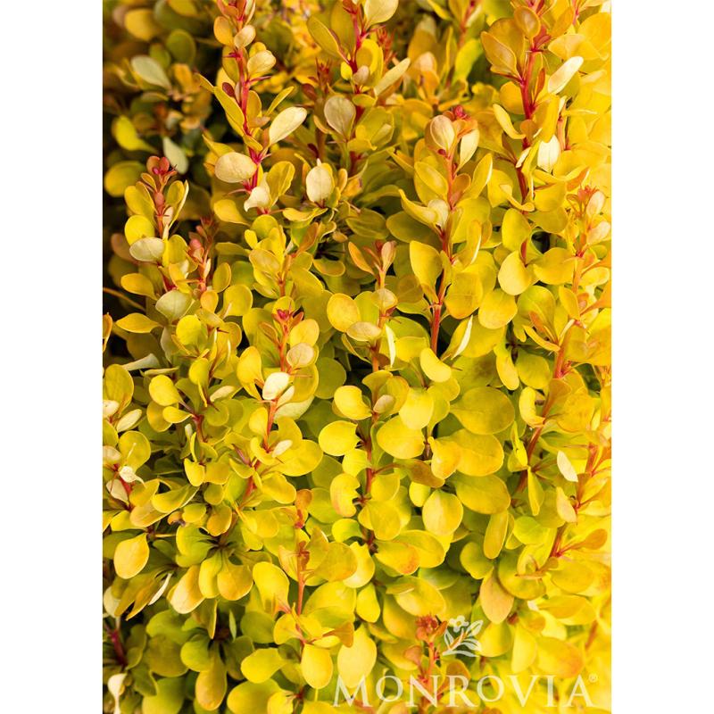 Description: Japanese barberry 'Golden Rocket' is a low-maintenance ornamental shrub known for its vibrant foliage. It's bright golden yellow foliage, orange-red autumn foliage. Bright red berries follow pale yellow, insignificant flowers in the spring. Its mature height is about 5 feet tall with a 2-3 foot spread. Use to brighten the landscape in mass plantings, as a specimen plant. It is important to practice occasional pruning to maintain its distinct 'rocket' shape. Due to its thorny nature, it is recommended that you wear gloves. Regular watering, especially during dry spells, ensures the best growth for Japanese barberry 'Golden Rocket'.