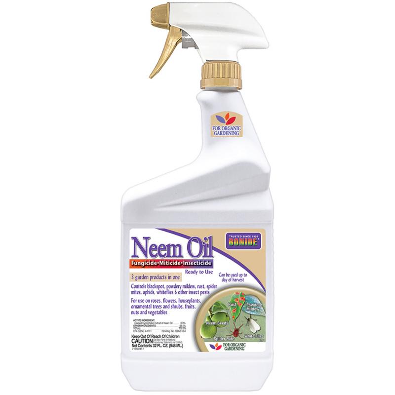 | An all-purpose insecticide, miticide, fungicide for organic gardening. Derived from the Neem seed. Use on roses, flowers, vegetables, herbs, spices, houseplants, trees, turf, and shrubs. Kills all stages of insects – eggs, larvae, and adults. Makes a great dormant spray. |