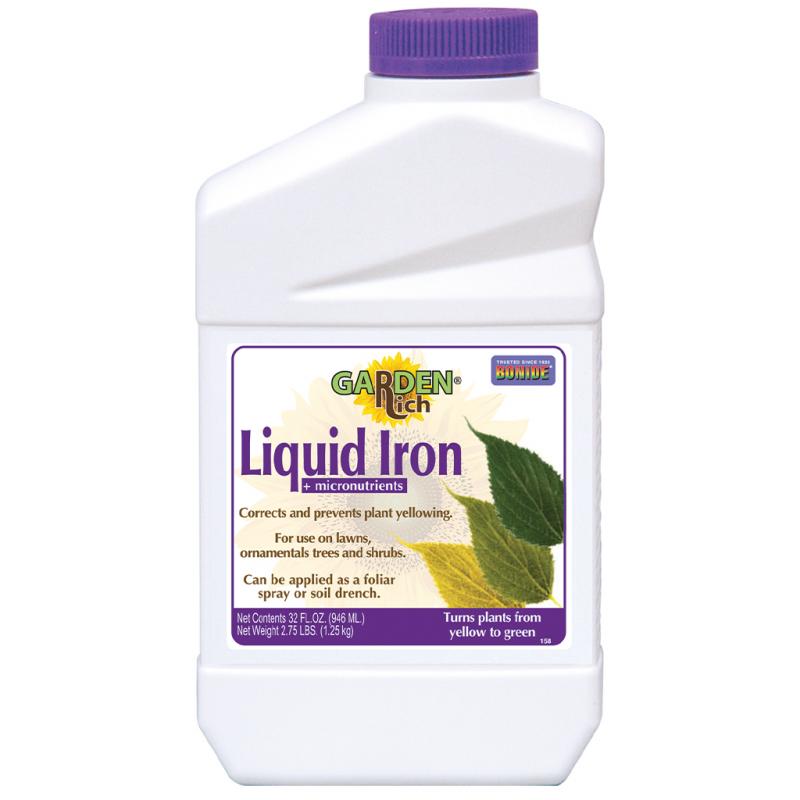 | Iron is a vital nutrient required by plants to form chlorophyll. Chlorophyll is what gives plants their green color. Promotes vigorous growth, and dark green color of turf, flowers, shrubs, trees. Sulfate formula designed to be immediately available to plants in need. Liquid Iron can be applied as either a foliar spray or soil drench. Carefully read directions before use. |