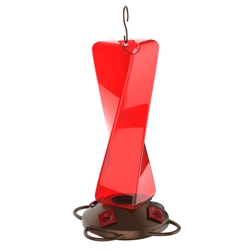 | This Mid-Century modern bottle puts a new twist on hummingbird feeders. When it is hung, it will twist and turn when birds land on it for a drink or when the wind starts moving. When this feeder moves, you will be mesmerized by how this bottle reflects and interacts with the sun. The four perches allow your friends to sit comfortably & eat from any of the four ports. |