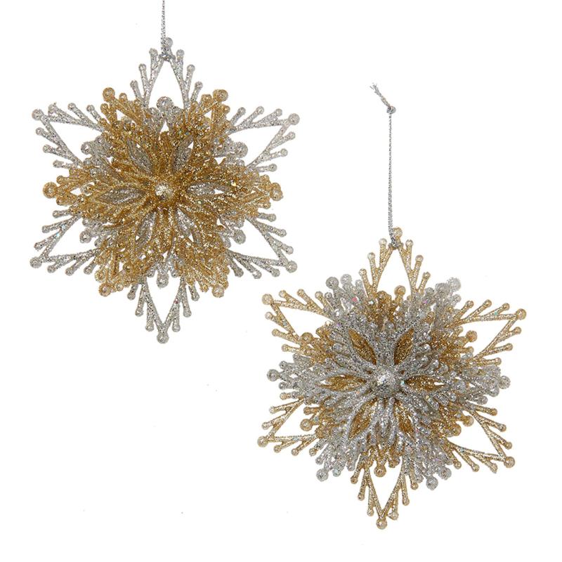 Add sparkle to any holiday décor or Christmas tree with these gold and silver snowflake burst ornaments from Kurt Adler. The assortment includes a silver snowflake with a gold burst and a gold snowflake with a silver burst.