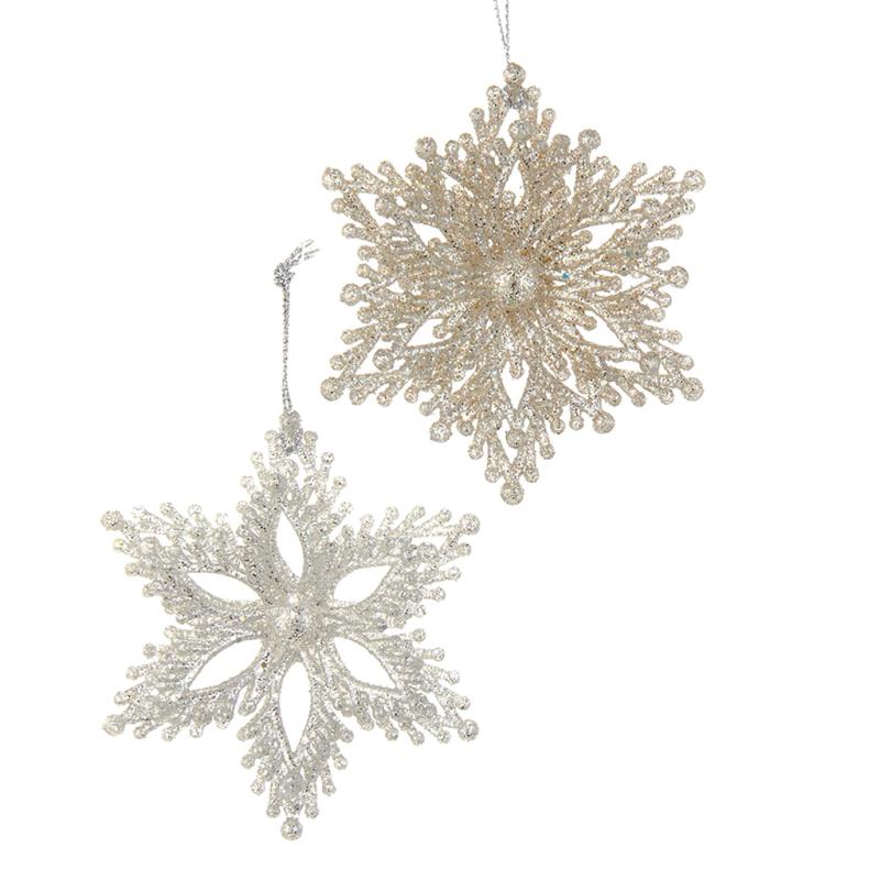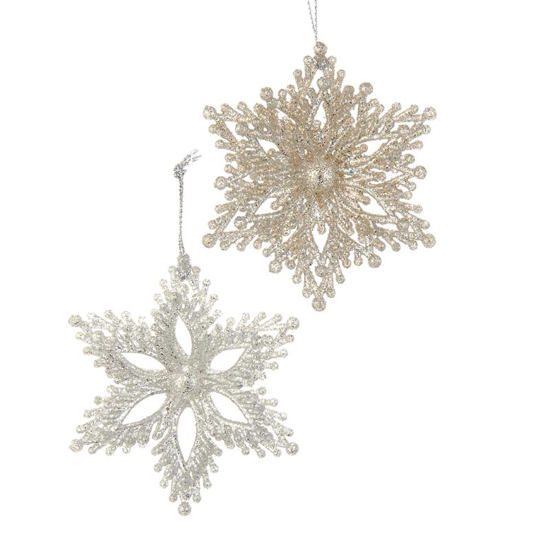 | Add some sparkle to any holiday décor or Christmas tree with these platinum glitter snowflake ornaments from Kurt Adler. This assortment features a snowflake with light platinum and dark platinum designs. Each ornament is shown in a glittered design. |