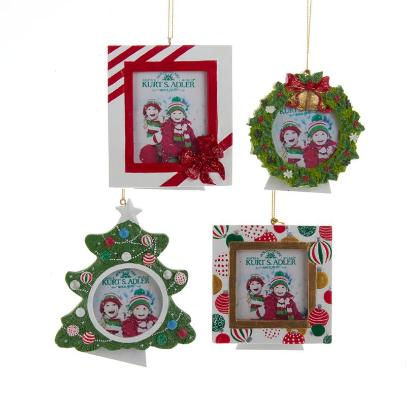 | These Christmas picture frame ornaments from Kurt Adler are a festive addition to any holiday décor or Christmas tree. Included in this assortment are a white frame with a red glittered bow, a glittered wreath frame, a decorated Christmas tree frame and a white frame decorated with red, white and green ornaments. |