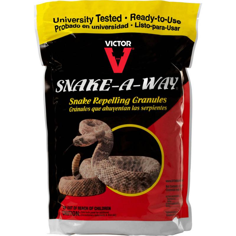 | Victor Snake-A-Way Snake Repelling Granules drive off garter snakes, rattlesnakes and other snake species from areas they are not wanted, including yards, parks and livestock areas. To use, apply this granular snake repellent around the perimeter of the area you want to protect, and the snakes will avoid the area. |