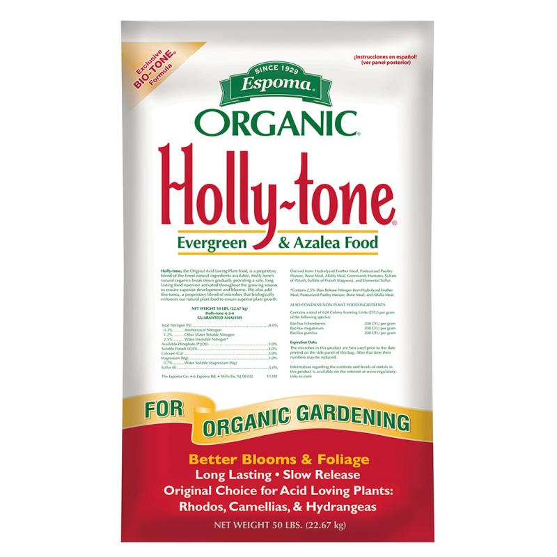 Description: Holly-tone All-Natural Plant Food 4-3-4 is an all-natural formula enhanced with Bio-tone beneficial microbes, which have been proven to help plants establish faster, develop deeper roots, and produce superior blooms. Formulated for acid-loving plants, including azaleas, dogwoods, evergreens and rhododendrons.