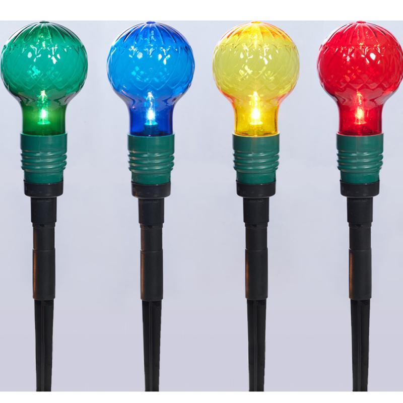 | The lighted lawn stakes have ten jumbo multi-color bulbs for Indoor and outdoor use. They are perfect for decorating lawns, pathways, and driveways. The steady-burning ten bulbs are pre-attached and have a total lighted length of 7.7 feet and 9 feet. They are UL-listed. |