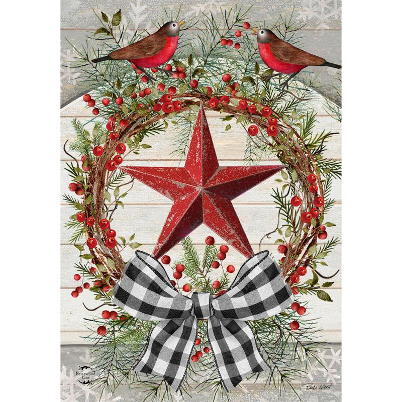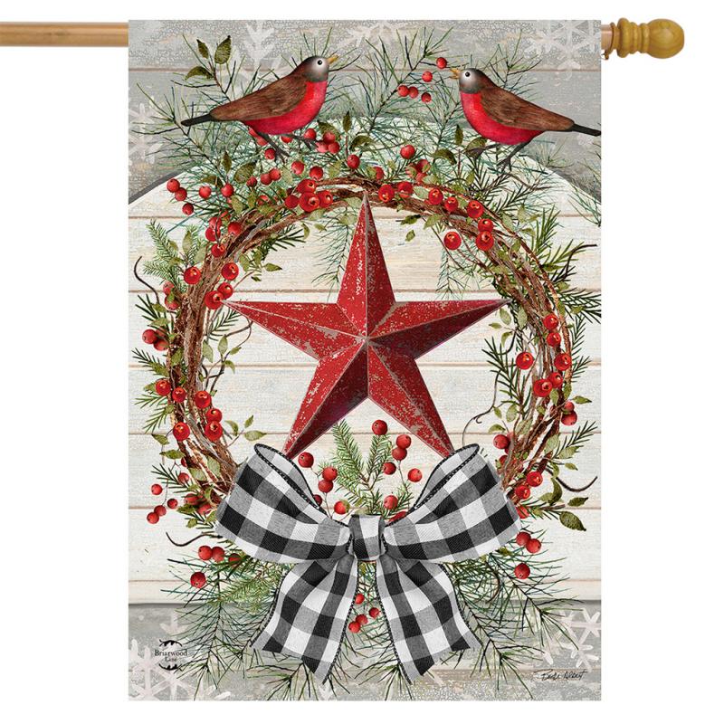 | Berry Wreath Barnstar Winter House Flag measures 28" x 40". Add a colorful, welcoming touch of the season to your home and garden with a premium decorative flag from Briarwood Lane. Their original artwork, printed on polyester material designed for outdoor display, provides unique designs that are as durable as they are beautiful! The flag poles are sold separately. |