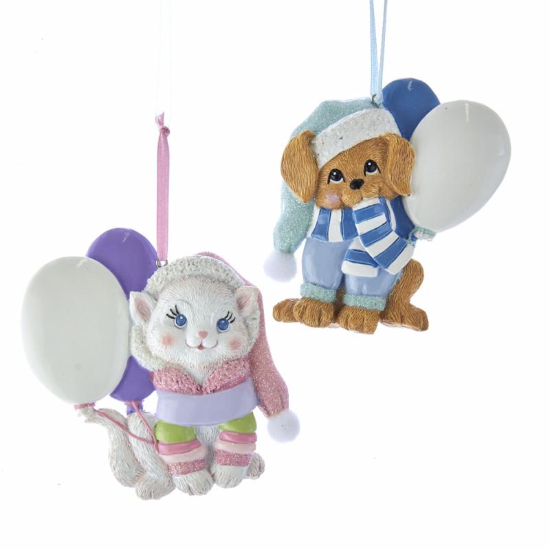 | This Kurt Adler Baby's 1st Christmas dog and cat ornament is a charming way to commemorate any Baby's 1st Christmas! These blue and pink ornaments feature a beautiful dog and cat, each with glittered outfits and balloons with space to write the baby's name. | |