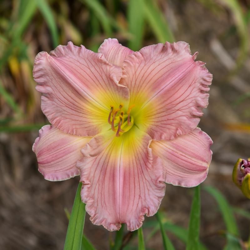 | 6", pink tepals with rose veining, golden yellow eye, and pale green throat Broad, nearly round petals and pointed sepals are deeply ruffled Broad, slightly recurved form Large blooms on a small plant make this one great for containers Foliage is evergreen in most climates |