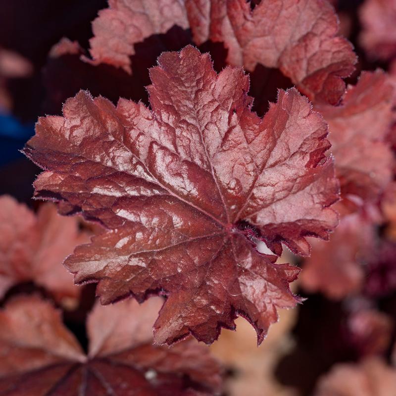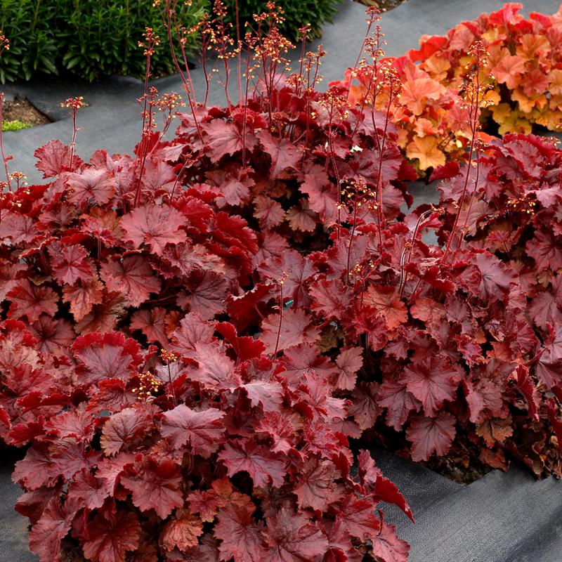 | Round leaves in clear, dark red adorn the dense, medium-sized mounds. This showy garden plant looks good longer in the season than other Heuchera. Great rust resistance. |