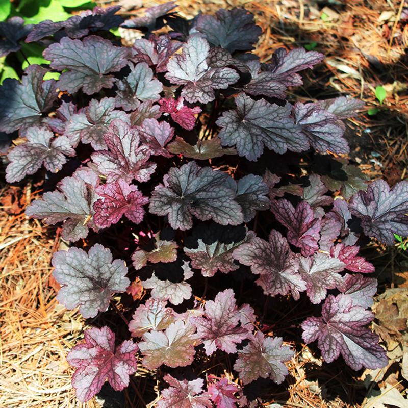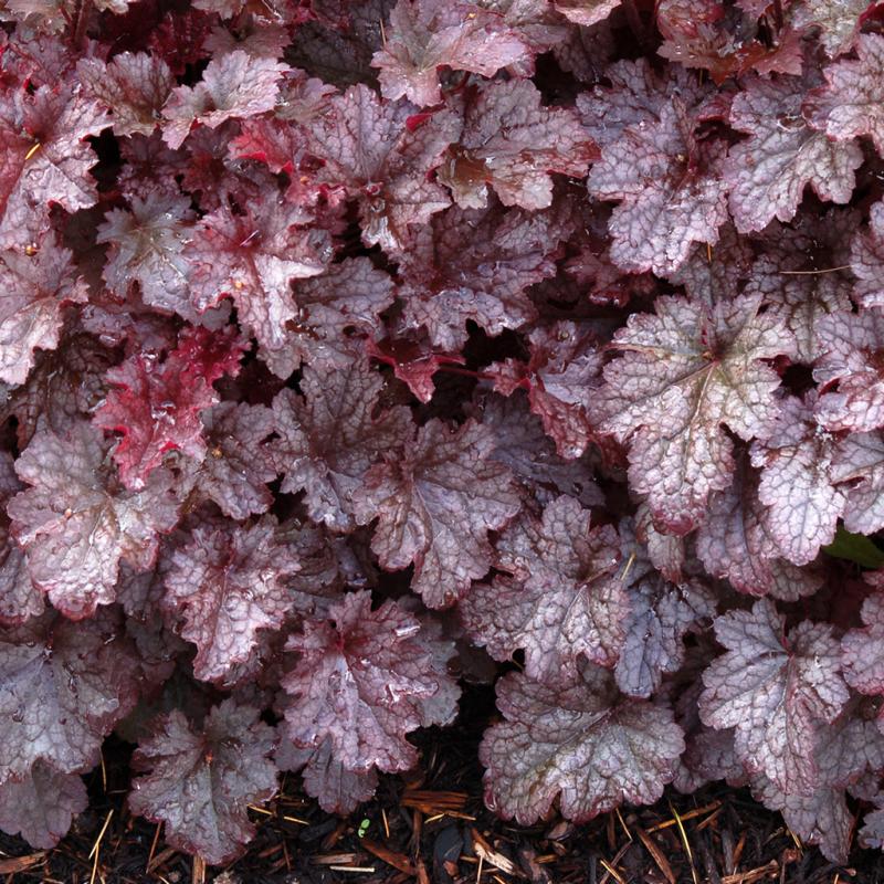 | Plum-colored foliage with darker purple veins. The leaves have a nice ruffle and pointed tips. When planted en masse, it forms a spreading clump and makes an excellent ground cover. Creamy white flowers appear in early summer. This is a Terra Nova® introduction. |
