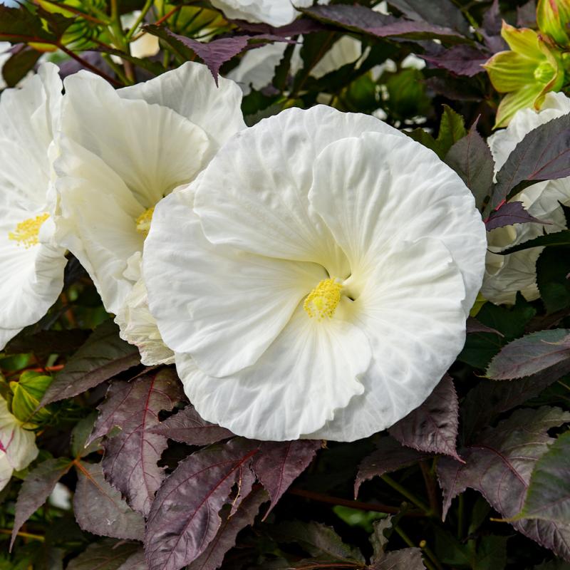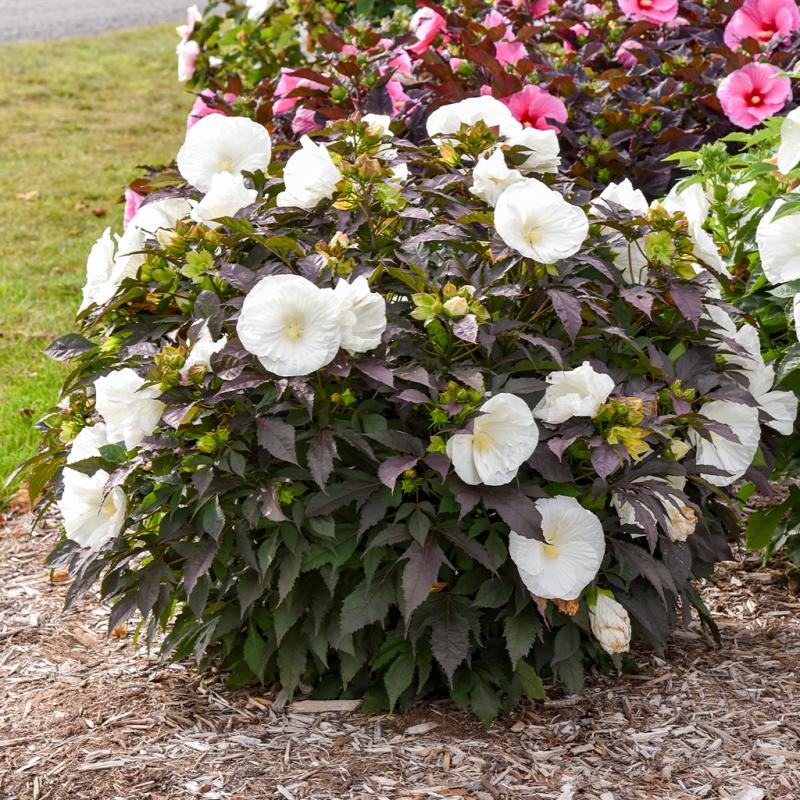 | The Coolies and Cream Hibiscus is a night and day combination of matte black foliage and pure white flowers. 'Cookies and Cream' emerge in late spring, already showing its dark foliage, the perfect backdrop to early season perennials. Like other dark-leaved Hardy Hibiscus, full sun is necessary to bring out the deepest foliage color. In midsummer, slightly cupped 6-7" bright white flowers will appear. Each bloom is absent the typical red eye of Hardy Hibiscus, appearing solid white. The back of each petal has a slight pink blush near the tip. Green calyxes follow the bloom and contrast nicely with the dark foliage. Compared with older varieties of herbaceous Hibiscus, 'Cookies and Cream' is exceptionally compact and sturdy. Despite the smaller habit size, this selection does not lack flowers. Blooms will appear the length of the stem for top-to-bottom flower coverage, causing 'Cookies and Cream' to bloom earlier and more prolonged than traditional varieties. These North American native plants bring massive, tropical-looking flowers to zone 4. Although they emerge later than most perennials in spring, these fast-growing plants can add an inch of new growth daily. They are excellent at brightening up end-of-season gardens. |