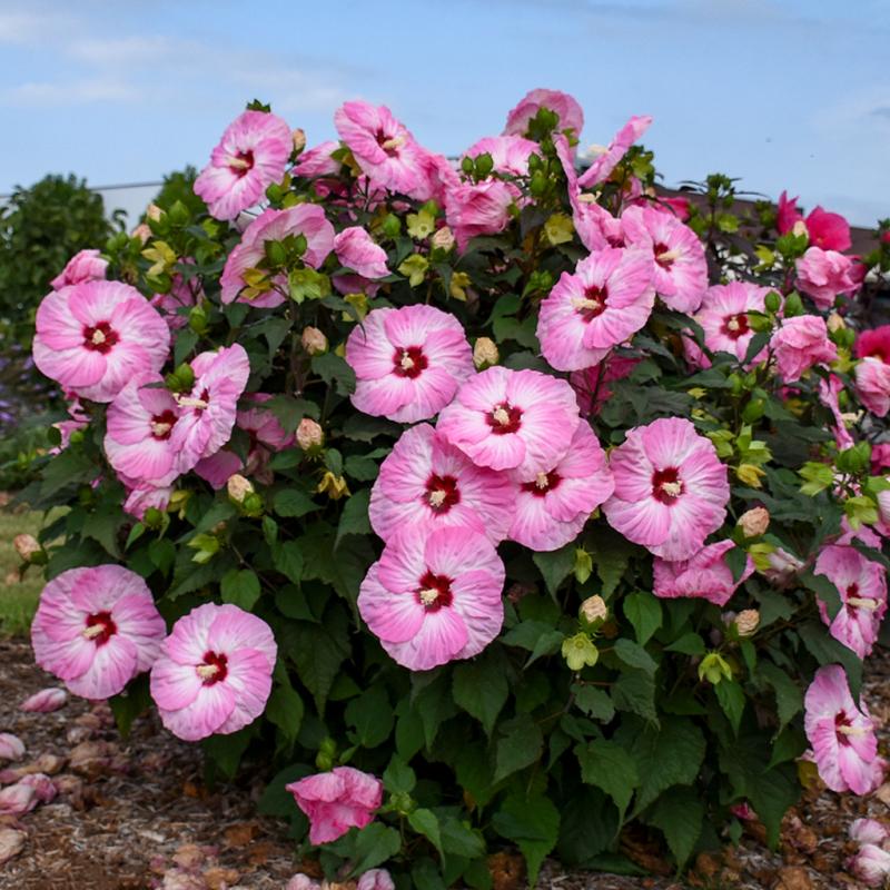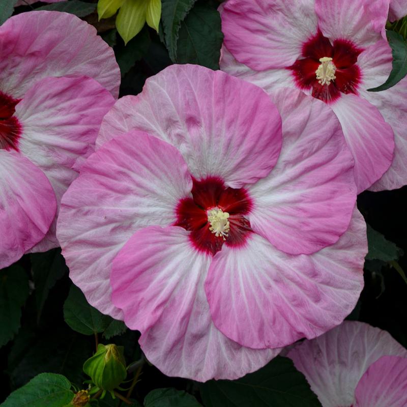| Show this off in your late summer landscape with the wild new pinwheel pattern of 'Spinderella.' Large, 8" white flowers have medium pink accented edges and a dark red eye. Dark green leaves form a tidy, dense, and well-rounded habit that will fit perfectly as the centerpiece of your garden. The impeccable habit significantly improves over other varieties of this flower type. These North American native plants bring massive, tropical-looking flowers to zone 4. Although they emerge later than most perennials in spring, these fast-growing plants can add an inch of new growth daily. They are excellent at brightening up end-of-season gardens. |