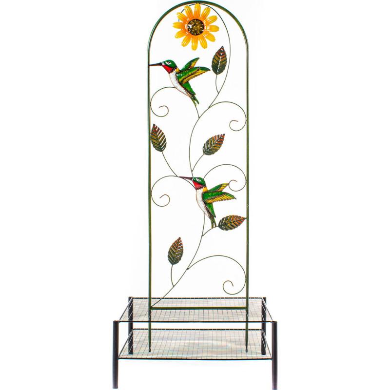 Sturdy powder-coated steel trellis with hand-painted, brightly-colored hummingbird, flower, and leaf accents.