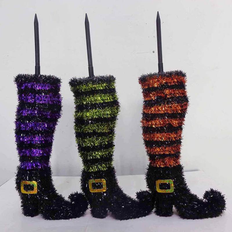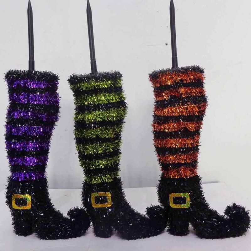 | Accent all your planters and walkways with the tinsel witch boot lawn stake. Black boots with assorted three color stockings, orange/black stripe, purple/black stripe, or green/black stripe. 17" H. |