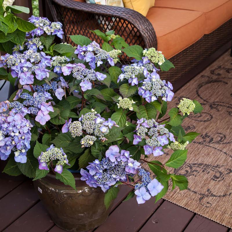 Description: Like all plants in the Endless Summer® Collection, Twist-n-Shout® produces abundant blooms on both old and new wood all summer. Lacy centers are surrounded by gorgeous blossoms of pink or periwinkle blue, depending on soil type. Sturdy red stems and glossy deep green leaves turn red-burgundy in fall to offer year-round interest in the garden. Easy to care for and hardy to zone 4, Twist-n-Shout® is an elegant stand-alone specimen, dramatic in combination with other plants, and compact enough for containers. (CPBR3688, C®)