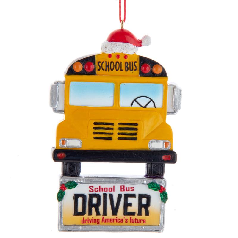 | This "School Bus Driver Driving America's Future" ornament from Kurt Adler is a festive addition to any holiday décor or Christmas tree. It features a yellow school bus with a red and white Santa hat. |
