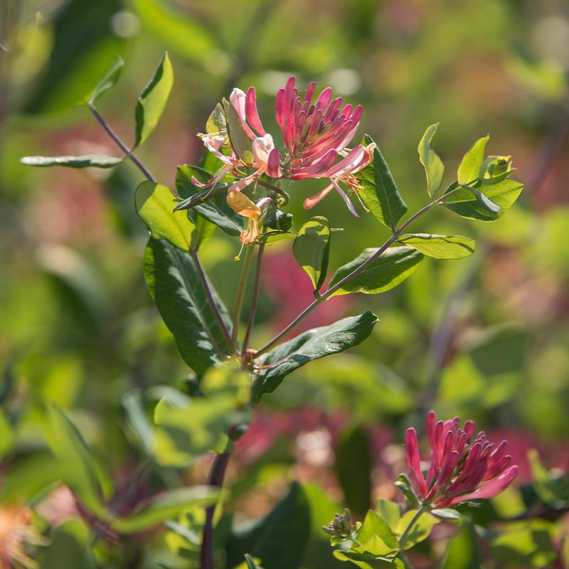 | Woody vine valued for its rosy-red and yellow flowers from June until frost. Fragrant flowers continue as new growth develops. Attractive oval blue green foliage on purplish-red glabrous stems. Shade tolerant. |