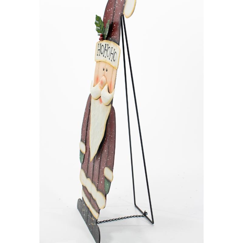 Metal Santa wearing hat which reads "Ho Ho Ho". Attached to metal stand.