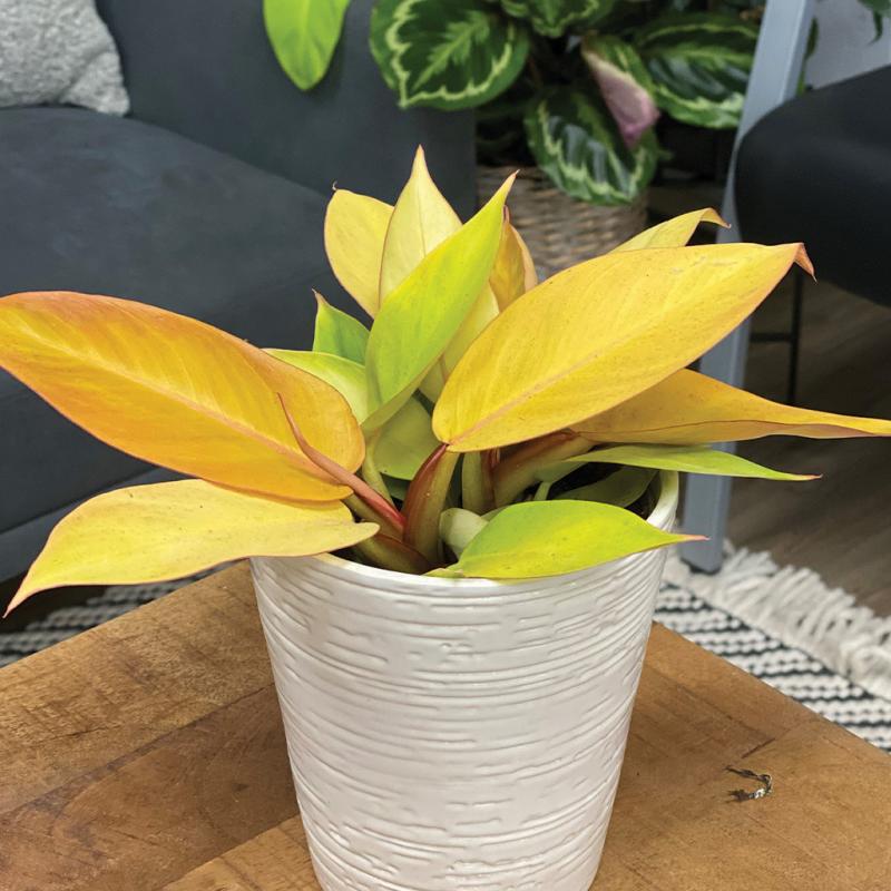 | This vibrant Philodendron has ever-changing leaves. New growth starts out a yellowish color, then changes to a coppery color, and finally settles into a darker green. It will certainly add a pop of color to any interior location! This is an upright Philodendron and will not need a support post. | |
