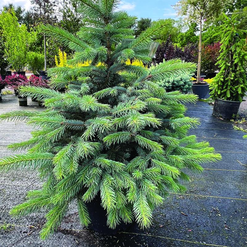 | A seed strain selection from West Montrose farms in Canada, Baby Blue® spruce has remarkable color reliability. The vibrant blue needles intensify with age, growing evenly around the branches, creating a full appearance. While this tree grows slowly, it has good vigor with a uniform and compact habit that requires virtually no shearing to maintain. It is an excellent blue variety that is more slender than the common Colorado Blue spruce and grows well in open areas. |